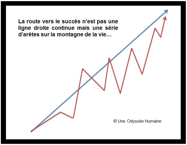 Rien n’est impossible mais de nombreux efforts sont nécessaires pour atteindre son but. La courbe du succès n’est pas une ligne droite continue mais bien une série d’arêtes sur la montagne de la vie. Et à chaque arête, chaque moment de fatigue, d’usure, d’envie d’abandonner, le choix sera soit de continuer en allant puiser dans ses ressources ultimes, soit d’arrêter et de redescendre. Clemenceau le disait très justement : « Le succès consiste à aller d’échec en échec sans perdre son enthousiasme« .