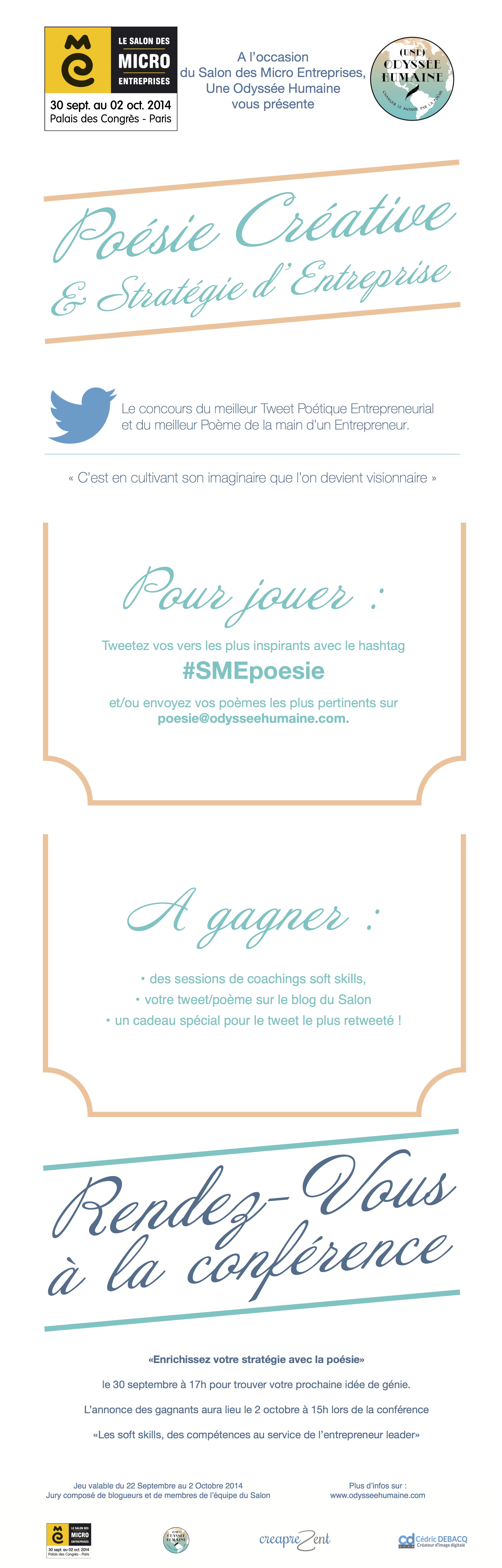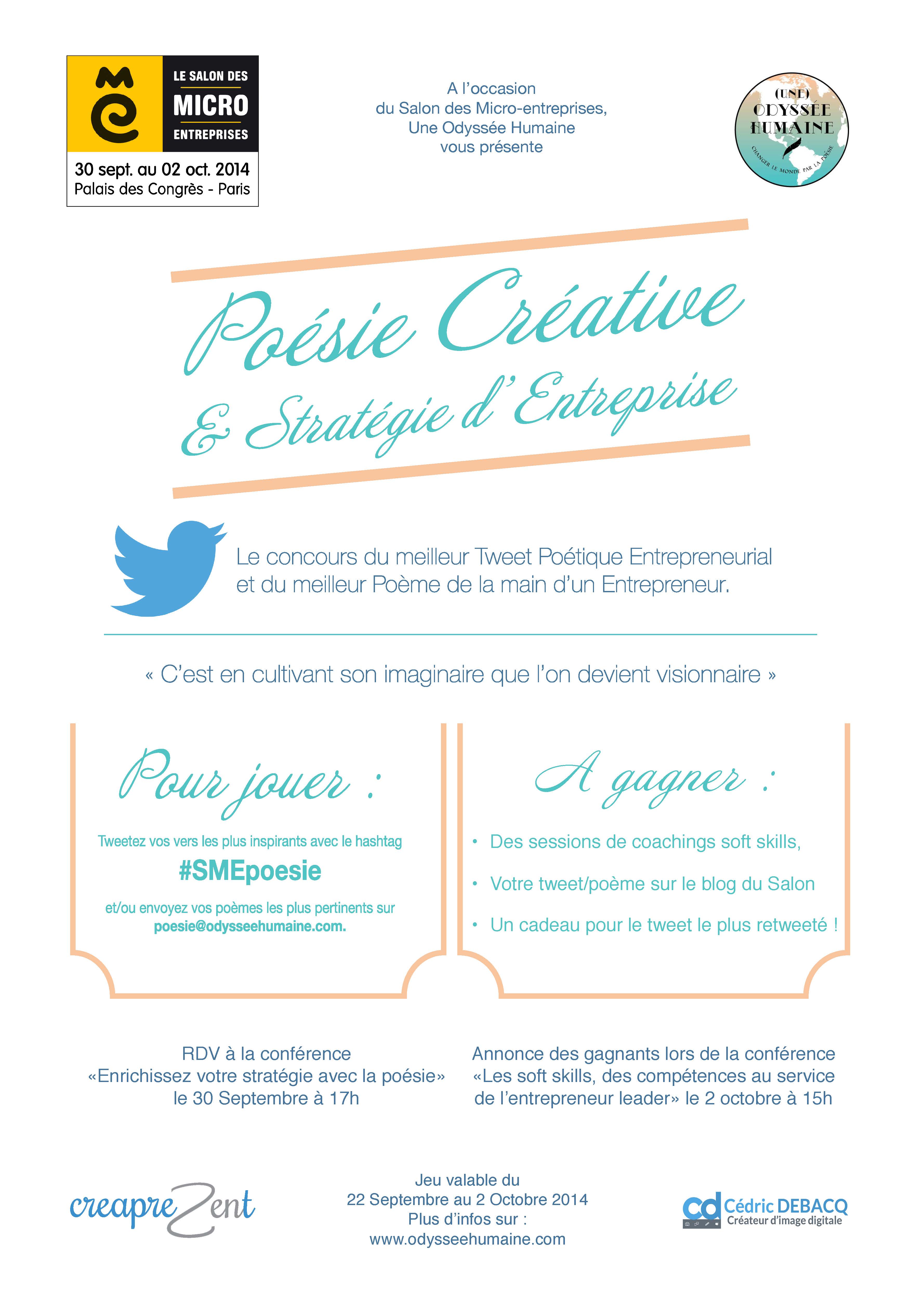 A l’occasion du Salon des Micro-Entreprises 2014 (du 30 septembre au 2 octobre), Une Odyssée Humaine vous propose un concours inédit de tweets poétiques et de poèmes d’entrepreneurs. Alors mettez de l’encre dans votre plume et de l’eau dans votre vie, afin de découvrir votre prochaine idée de génie, une nouvelle stratégie pour votre entreprise, ou simplement partager vos inspirations d’avenir et vos talents artistiques. Envoyez-nous vos créations (slogans, jeux de mots, vers) avec le hashtag #SMEpoesie pour vos tweets et l’email poesie@odysseehumaine.com pour vos poèmes!