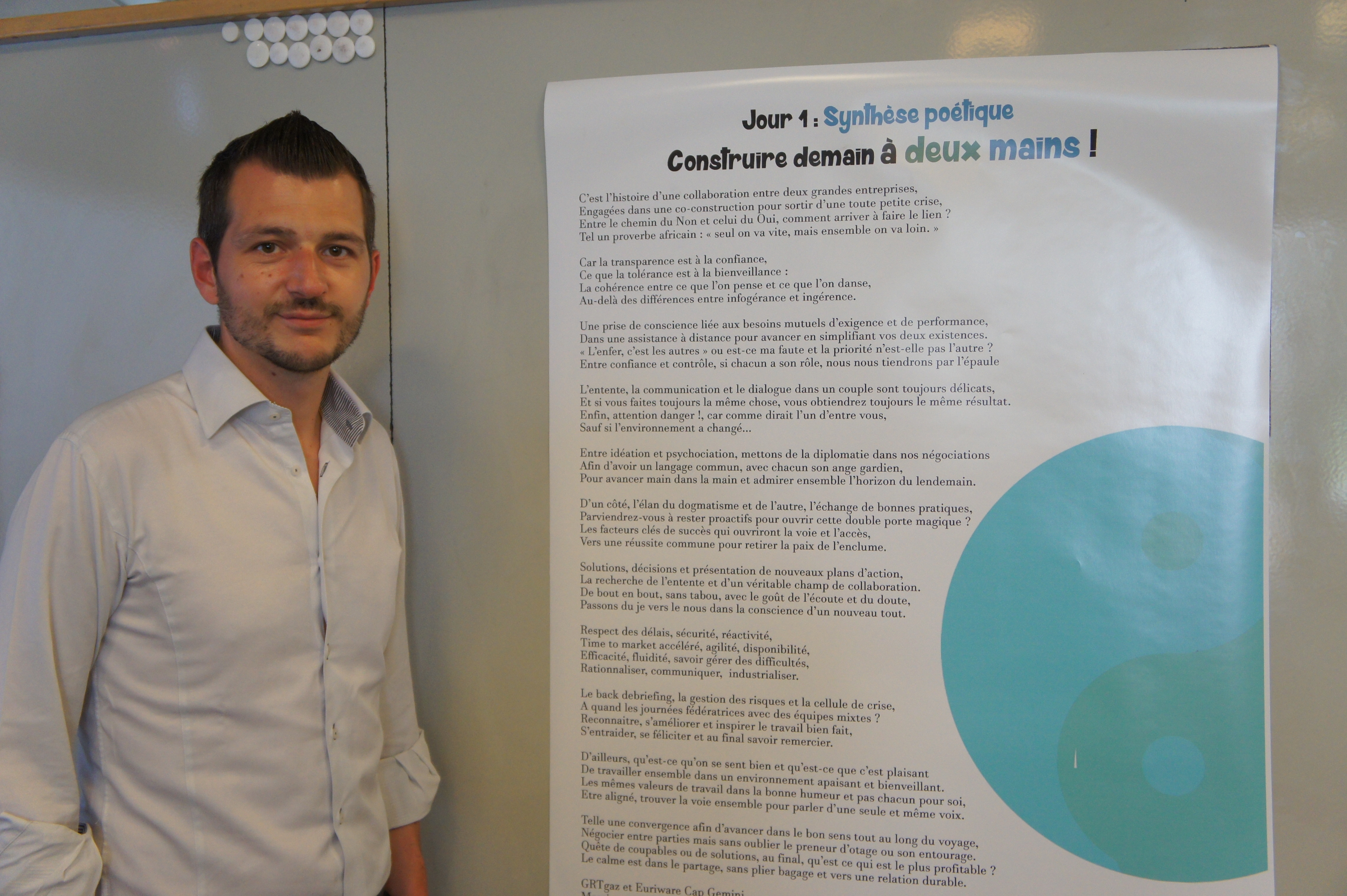 Vincent Avanzi, poète d’entreprise, intervient avec l’ASE notamment dans le cadre de la facilitation de synthèses poétiques. Voici un exemple de facilitation poétique et de collaboration graphique utilisable lors de sessions de plusieurs jours avec des entreprises pour apporter des solutions à des problématiques des entreprises. Ici une synthèse poétique en fin de session avec un livrable imprimé pour l’entreprise. Le thème : la collaboration et le partenariat entre deux structures.