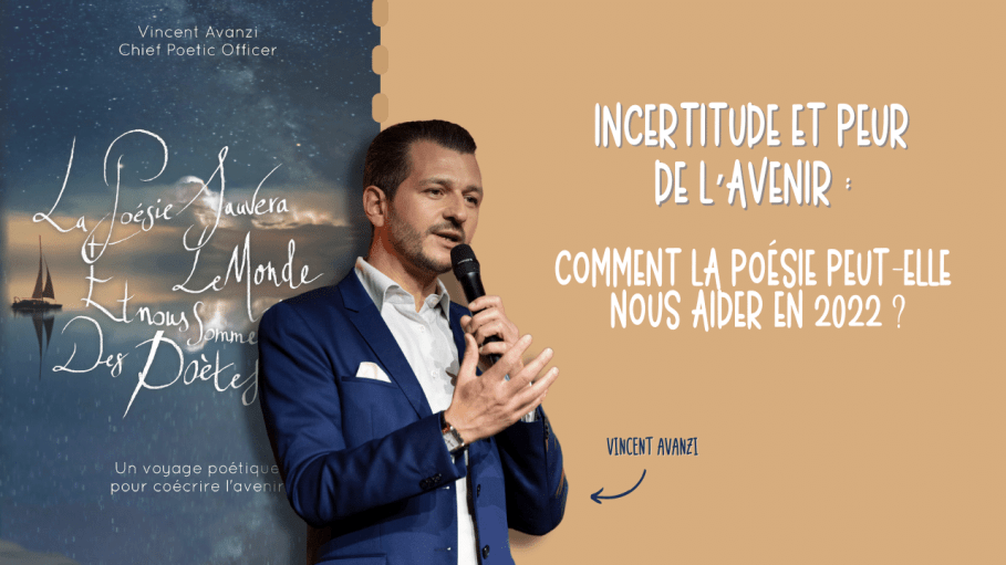 « Faut-il encore vous présenter notre « chief poetic officer » favori, Vincent Avanzi ? A l’occasion de la sortie de son nouveau livre « La poésie sauvera le monde et nous sommes tous des poètes » accompagné d’un album audio musical, Vincent nous aide à comprendre comment la poésie peut nous aider à surmonter deux peurs que nous sommes nombreux à traverser en ce début 2022 : l’incertitude et la peur de l’avenir.