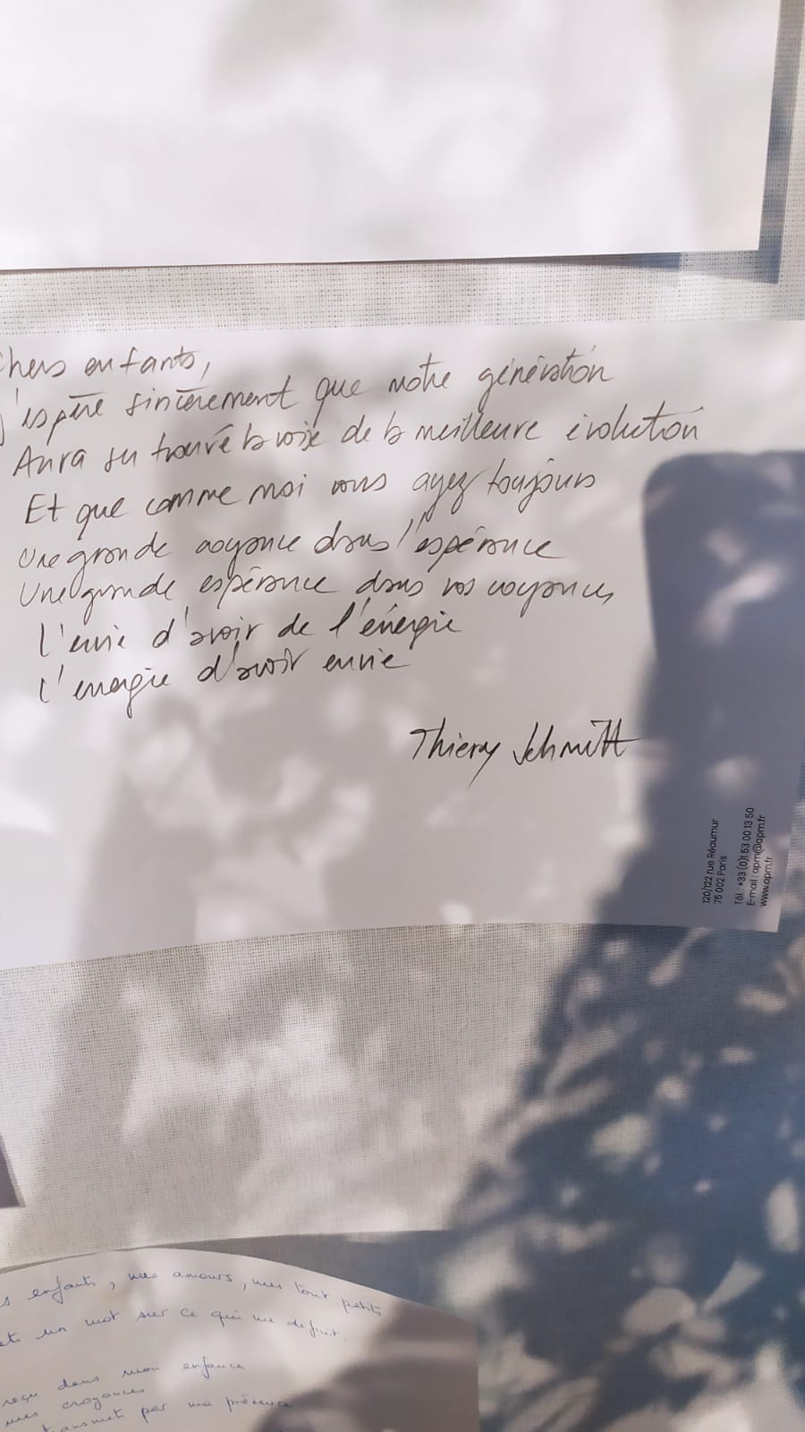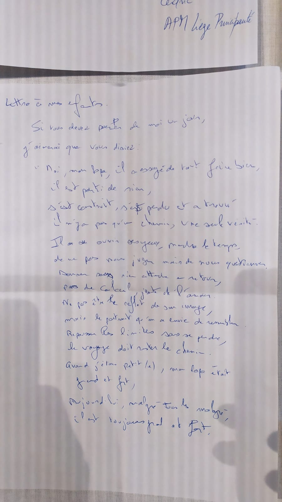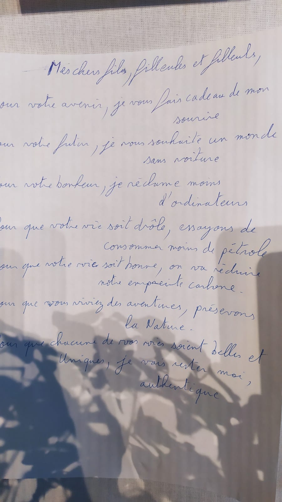 Voici quelques exemples de lettres des dirigeants destinées à leurs enfants ou aux générations futures à horizon 2040. Elles ont été écrites en séance, partagées sur scène puis exposées sur une Fresque Poétique Collective avant d’être placées dans la Malle jusqu’en 2050. Très belles lectures, quoi de plus beau qu’un engagement pris d’un parent à son/ses/des enfants ! Peut-être une invitation poétique pour vous également afin d’écrire la vôtre et de la lire à vos enfants ou des enfants de votre famille. La seule règle pour l’écriture, c’est d’écrire…. avec le coeur. Le reste des lettres, à découvrir, dans 27 ans.