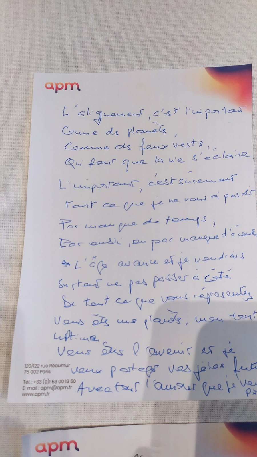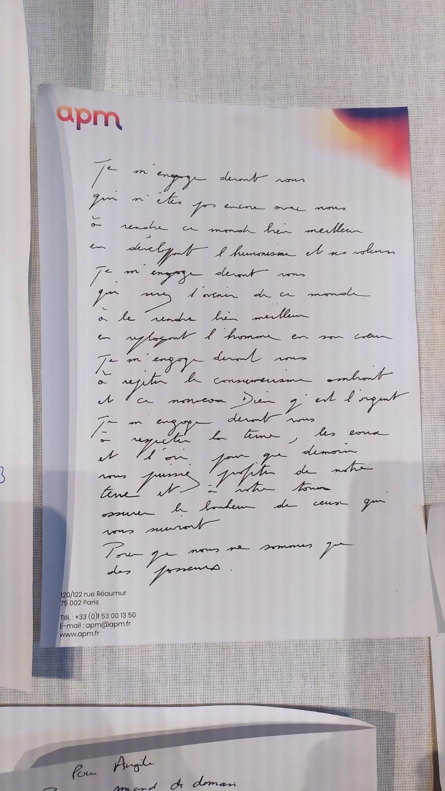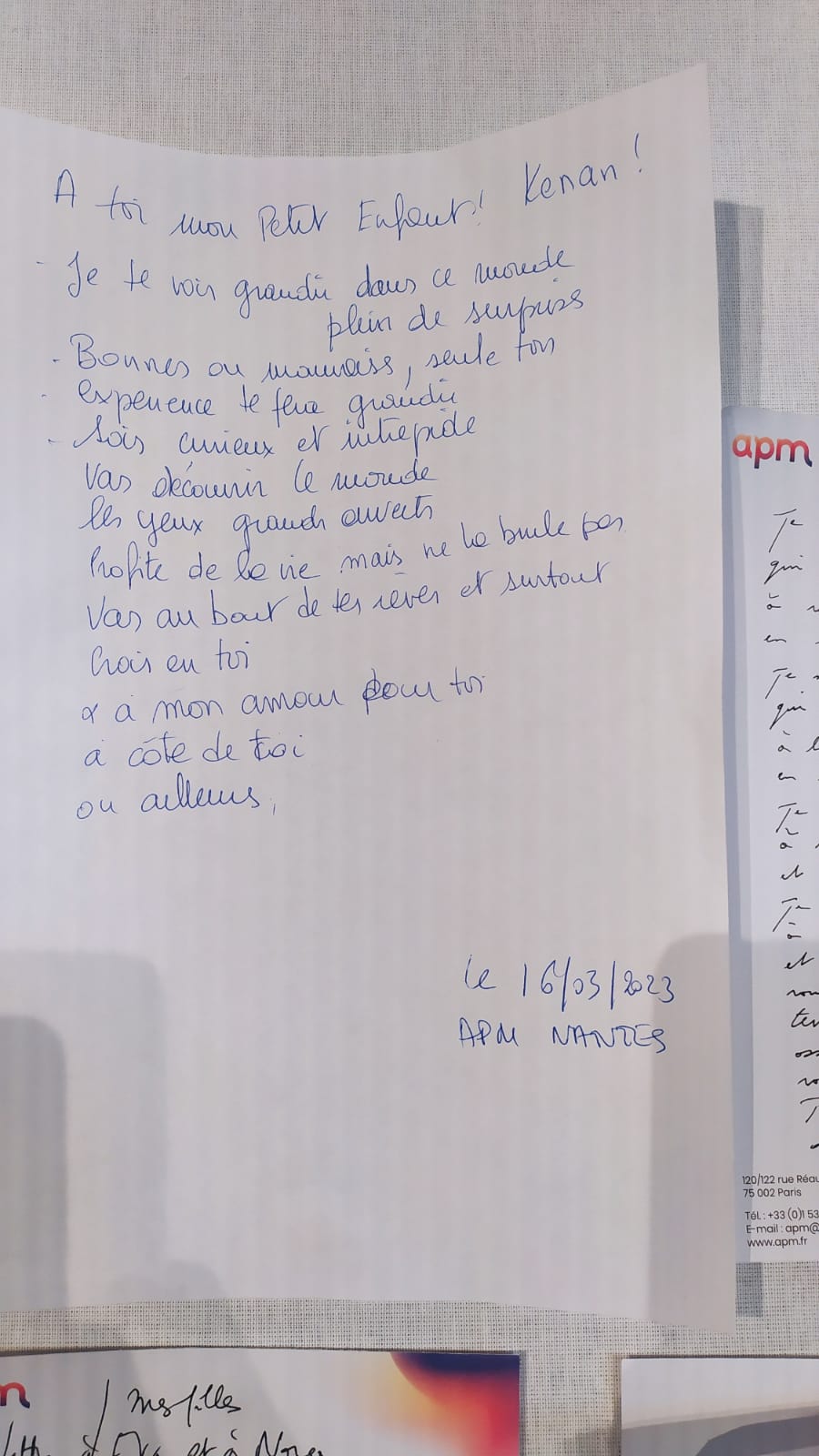 Voici quelques exemples de lettres des dirigeants destinées à leurs enfants ou aux générations futures à horizon 2040. Elles ont été écrites en séance, partagées sur scène puis exposées sur une Fresque Poétique Collective avant d’être placées dans la Malle jusqu’en 2050. Très belles lectures, quoi de plus beau qu’un engagement pris d’un parent à son/ses/des enfants ! Peut-être une invitation poétique pour vous également afin d’écrire la vôtre et de la lire à vos enfants ou des enfants de votre famille. La seule règle pour l’écriture, c’est d’écrire…. avec le coeur. Le reste des lettres, à découvrir, dans 27 ans.