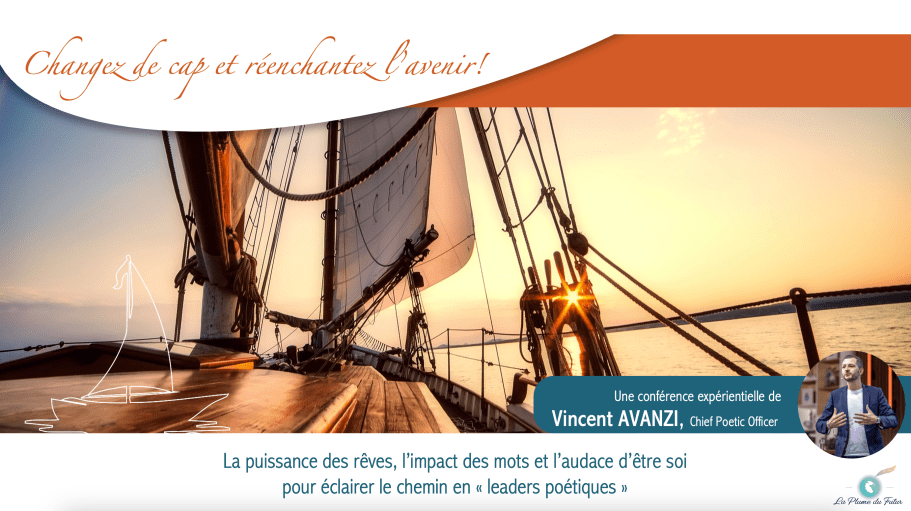 A Propos de l’Auteur : Vincent Avanzi est Chief Poetic Officer, plume de dirigeants, coach en leadership et fondateur de La Plume Du Futur. Ancien manager d’entreprises (Microsoft, EY, Dior), globe-trotter et journaliste aux Echos, il est l’auteur de dix ouvrages dont « Trouver son Point Génial » (Marabout), « La poésie sauvera le monde et nous sommes tous des poètes » et « Poetic Leaders, The Poetic Speeches Collection » (A Human Odyssey). Il accompagne leaders, marques et organisations sur le réenchantement de leur storytelling, l’alignement de leur leadership et leur engagement sur la « sustainabilité ». Il délivre enfin des discours poétiques dans des conventions internationales et anime des conférences sur l’art du discours et le pouvoir des mots qui réenchantent le monde. Son motto : Réenchanter le monde avec la poésie. Pour toute demande, envoyer un mail à contact @ odysseehumaine.com.