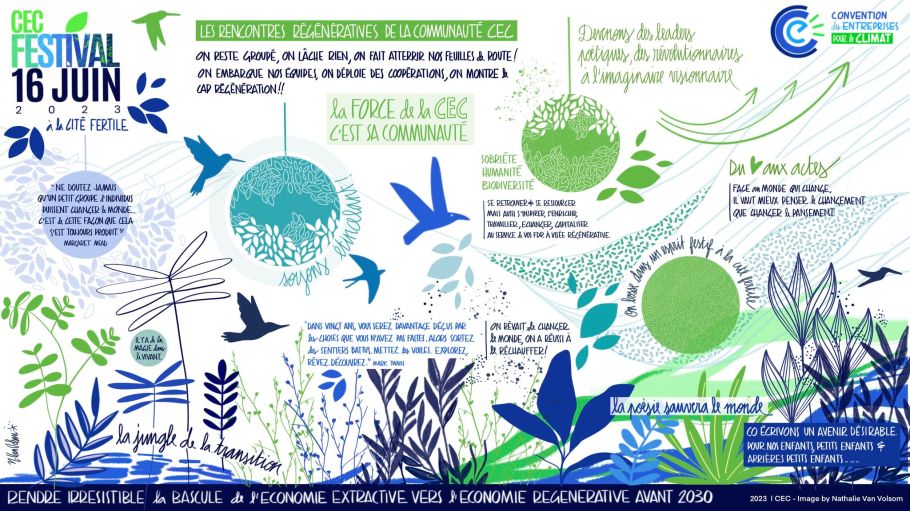 Yannick Servant, Kako Dubs, Olivier RENAUD, Chloé GAPP, Ahcene MOULLA, Roselyne Lecuyer, Alexandre CHRETIEN, Armelle du Peloux, Morgan Marzin, Andra Morosi, Ludovic Morawa Bruno Rousseau Caroline VAN RENTERGHEM Martin Armingeat Sophie Robert-Velut Boualem LAOUADI et tant d’autres 💙 Toujours ravi d’être aux côtés de cette superbe communauté d’avenir de femmes et d’hommes qui ont la conscience, le courage et la détermination de changer eux-mêmes et porter le changement dans leurs entreprises vers un avenir plus sobre, durable, vivant et régénératif. Les témoignages des modifications profondes des modèles d’affaires en sont la preuve. Bravo à eux. Le futur sera aussi la somme de ces changements vers le point de bascule. Et en fin de conte, notre futur universel s’écrira par la grâce de nos poésies personnelles qui se rencontrent dans l’essentiel et forment cette étincelle de vie éternelle. La superbe fresque ci-dessus est signée Nathalie VAN VOLSOM,