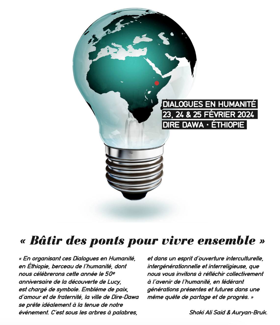 Les Dialogues en Humanité en Ethiopie se sont tenus les 23-25 Février 2024 à Dire-Dawa sur le thème « Bâtir les ponts pour vivre ensemble » dans le berceau de l’Humanité, à l’occasion du 50ème anniversaire de la découverte de Lucy. . Une délégation internationale est venue de nombreux pays (Djibouti, Somalie, Mali, Tunisie, Madagascar, France, Belgique, les US, l’Angleterre) pour une semaine de rencontres, d’échanges et d’agoras autour de questions essentielles telles que la résolution de la paix, l’empowerement féminin, l’éducation des enfants, la lutte contre le dérèglement climatique, les risques inter-éthniques et la richesse interculturelle, la situation de famine dans le pays ou encore la coécriture de notre avenir.