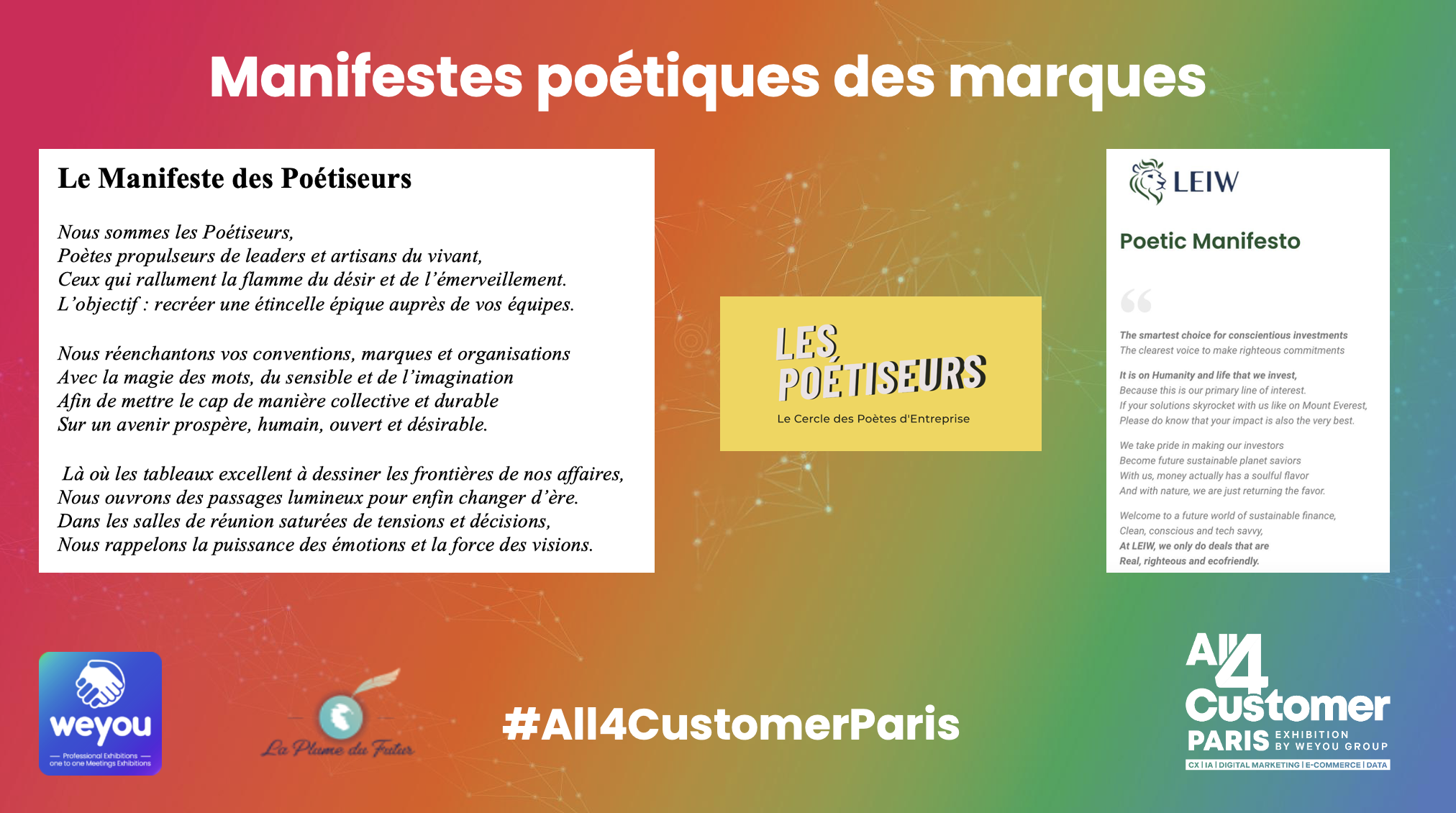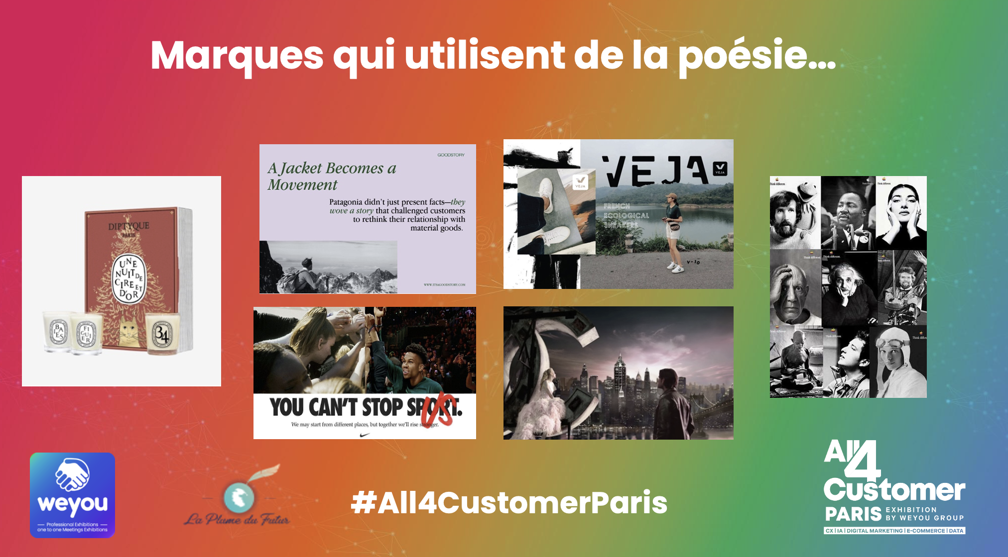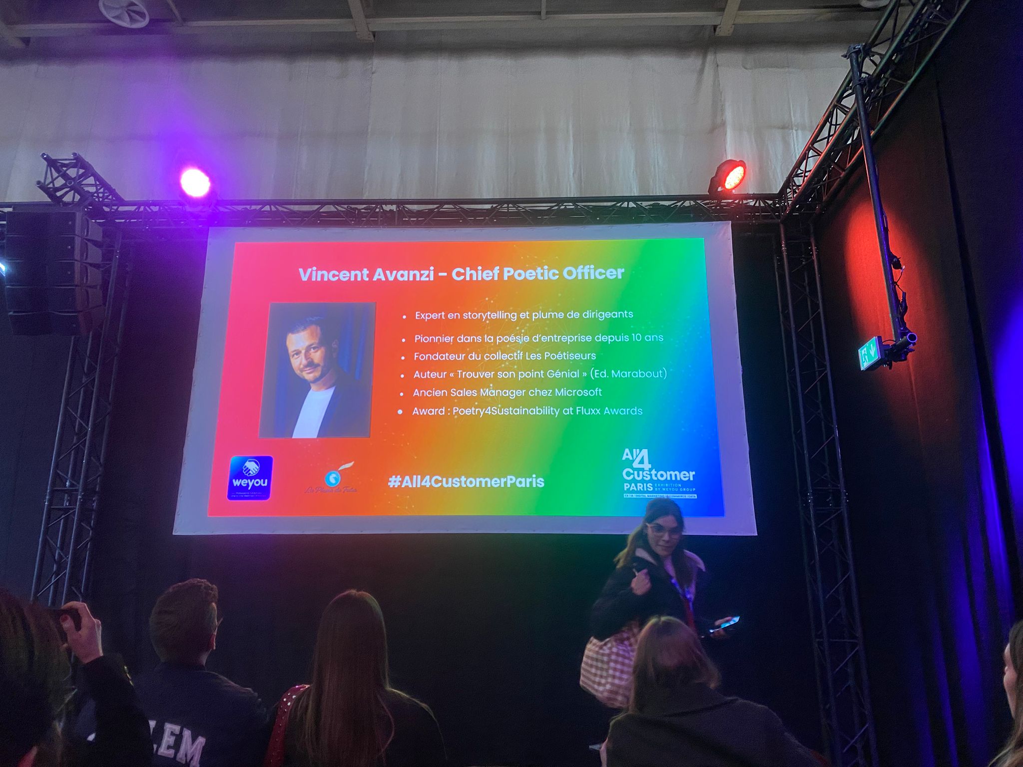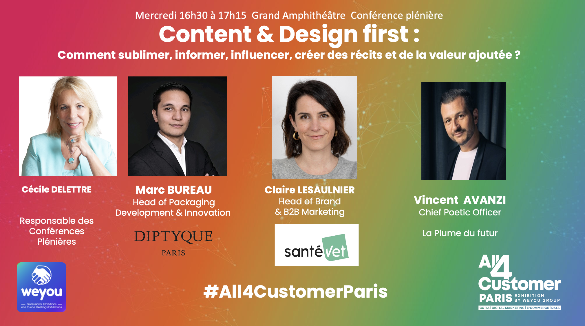 Discours poétique de Vincent Avanzi, Chief Poetic Officer, lors du Salon All4Customer pour clôturer la très belle conférence « Content & Design first : Comment sublimer, informer, influencer, créer des récits et de la valeur ajoutée ? » orchestrée et modérée par l’excellente Cécile Delettre aux côtés de Marc BUREAU (Diptyque) et Clara Lesaulnier (Santévet). Replay complet de la conférence bientôt en ligne.